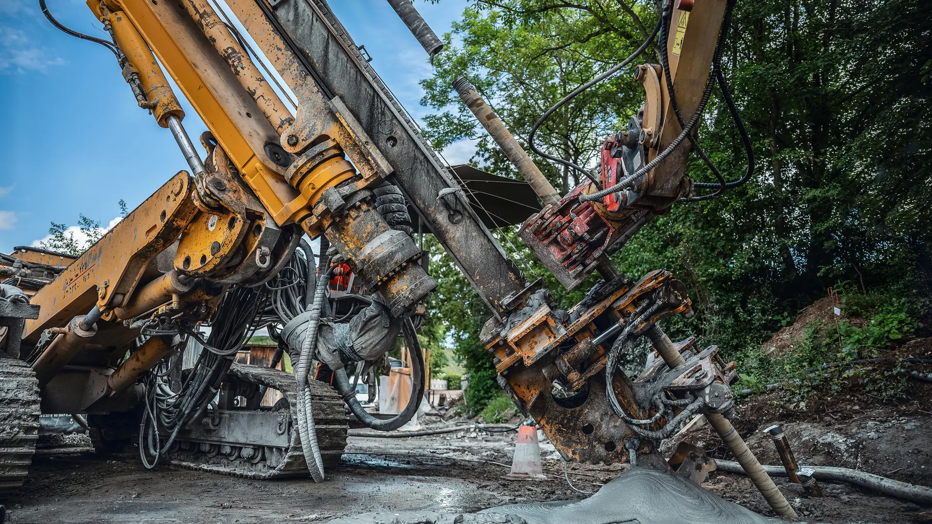 Der Bauablauf gliedert sich in fünf Phasen: Zunächst wurden Messstellen errichtet und geophysikalische Untersuchungen durchgeführt, um die Ausgangslage zu dokumentieren und die Planung abzusichern. In Phase zwei geht es an die Kernaufgabe: Das Bohrteam führt insgesamt 330 Bohrungen bis in 33 m Tiefe mit dem Sonic-Drilling-Verfahren aus. Dabei kommt ein Spezialbohrgerät mit 3D-GNMSS-Messung der BTR zum Einsatz, um die Verpressgestänge präzise zu positionieren. Anschließend übernehmen die Experten von Bauer Spezialtiefbau die Verdichtungsinjektionen mit der speziell konfigurierten KLEMM KR 806-2DB. Insgesamt werden voraussichtlich rund 8.000.000 l eigens entwickelter Mörtel in gestörte Bodenschichten eingebracht – und das nach einem exakten Stufenverfahren. Allein hierfür sind 20 Monate vorgesehen. In Phase drei erfolgen erneut geophysikalische Untersuchungen und Seilkernbohrungen. Phase vier umfasst Nachvergütungen mit Zementinjektionen, um verbleibende Lücken zu füllen.