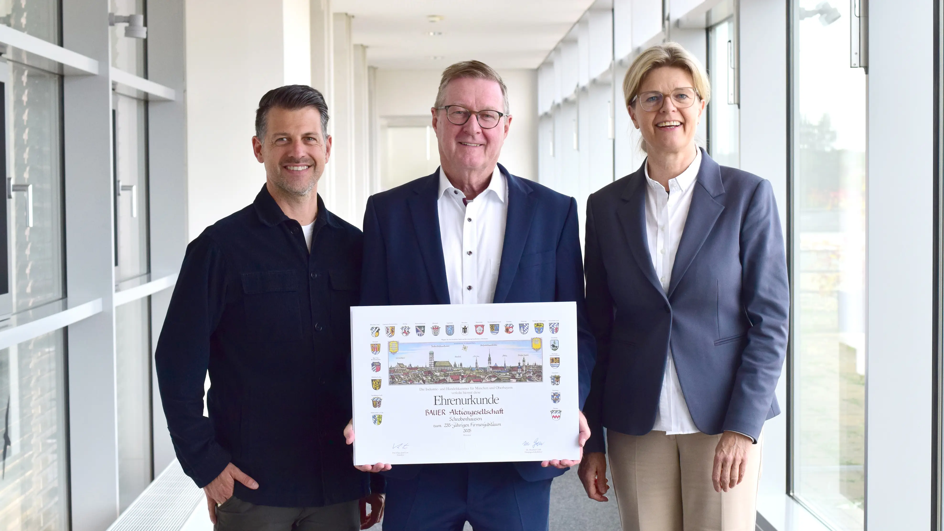 Schrobenhausen, Germany – At the end of May, BAUER AG was honored by the Chamber of Industry and Commerce for Munich and Upper Bavaria (IHK) with a Certificate of Honor in recognition of its 235th anniversary. Elke Christian, a member of the executive management of the IHK Munich and Upper Bavaria, and Christian Kroemer, Chair of the IHK Regional Committee for Neuburg-Schrobenhausen, were pleased to present the award to Hartmut Beutler. What began in 1790 as a small craft business has grown into a globally operating company with around 11,000 employees worldwide.